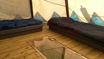 Ici, on dort dans des tipis, dont certains sont carrément au-dessus de l'eau, accessibles uniquement par bateau. En plein centre, on a eu l'idée d'encastrer une vitre hermétique pour y voir passer les poissons et ainsi jouir d'un contact vraiment